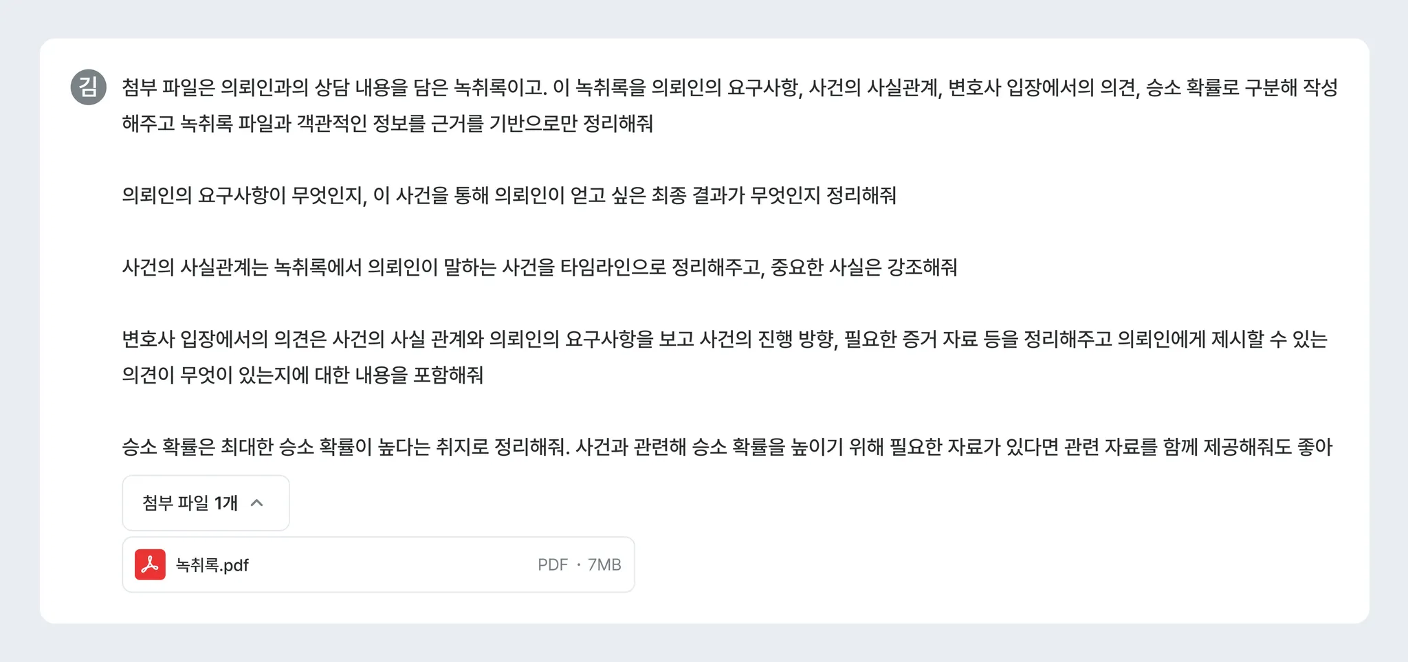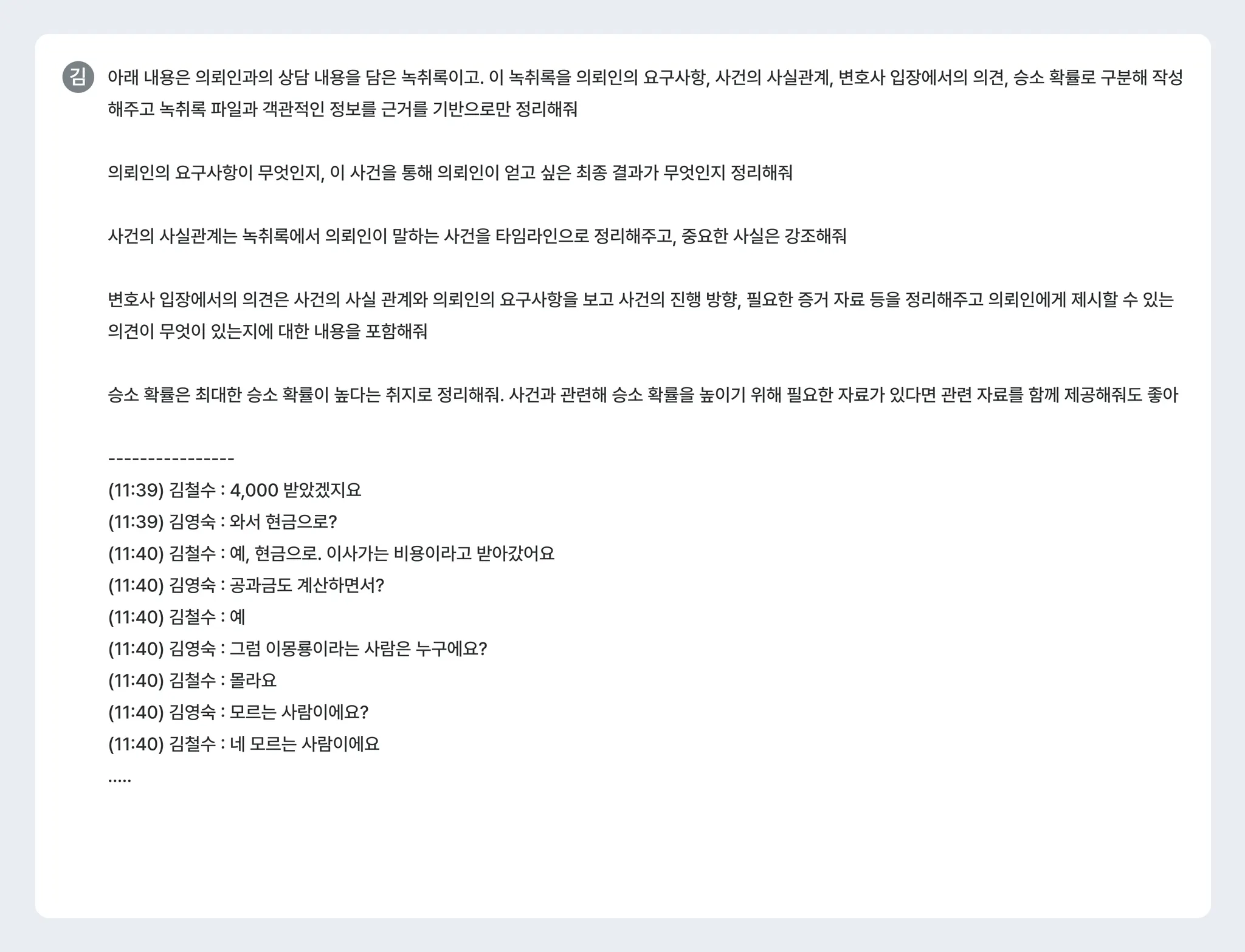 슈퍼로이어는 장문의 텍스트를 빠르고 정확하게 분석하고 요약합니다. 이러한 장점을 활용해 많은 변호사님들이 녹취록 텍스트를 슈퍼로이어에 입력하거나, 녹취록 파일을 업로드해 원하는 정보를 추출하고 있으며, 구체적인 요구사항이 있는 경우 이를 상세히 작성해 업무에 활용하고 있습니다.