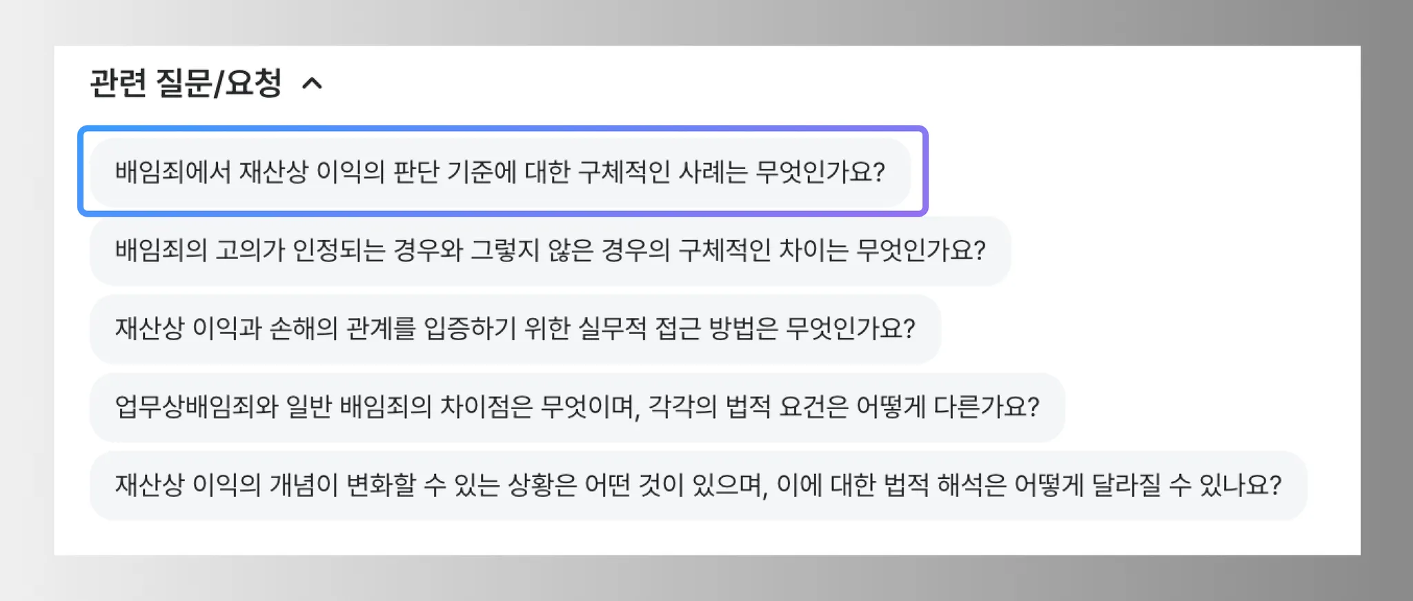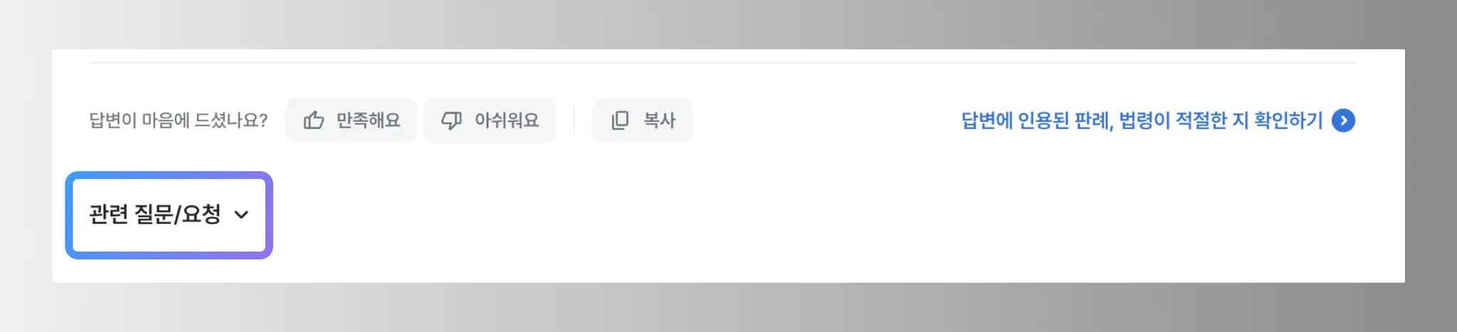 이전 대화에서 제안된 후속질문들은 자동으로 숨겨져 있습니다. '관련 질문/요청' 버튼을 클릭하시면 이전 대화에서 제안된 질문들을 다시 확인하실 수 있습니다.