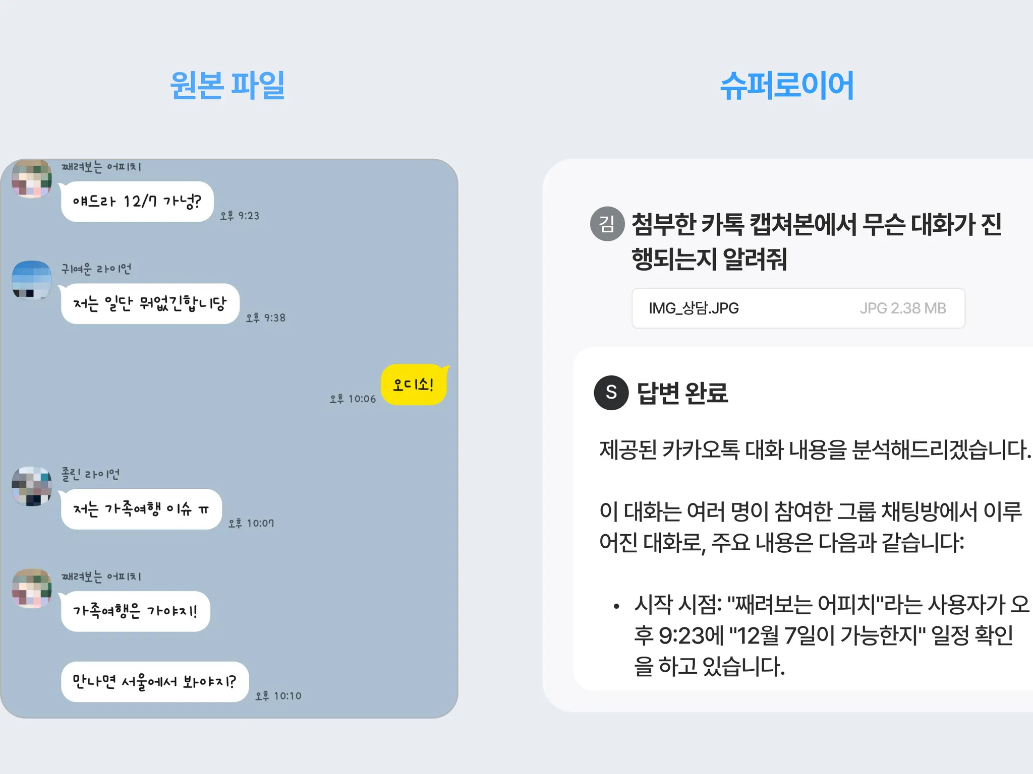 슈퍼로이어는 강력한 OCR (Optical Character Recognition) 기술로 스캔 PDF, 카카오톡 대화방 캡쳐, 손 글씨 메모 등의 이미지를 기계가 인식할 수 있는 텍스트 포맷으로 변환하여 업무를 지원합니다.