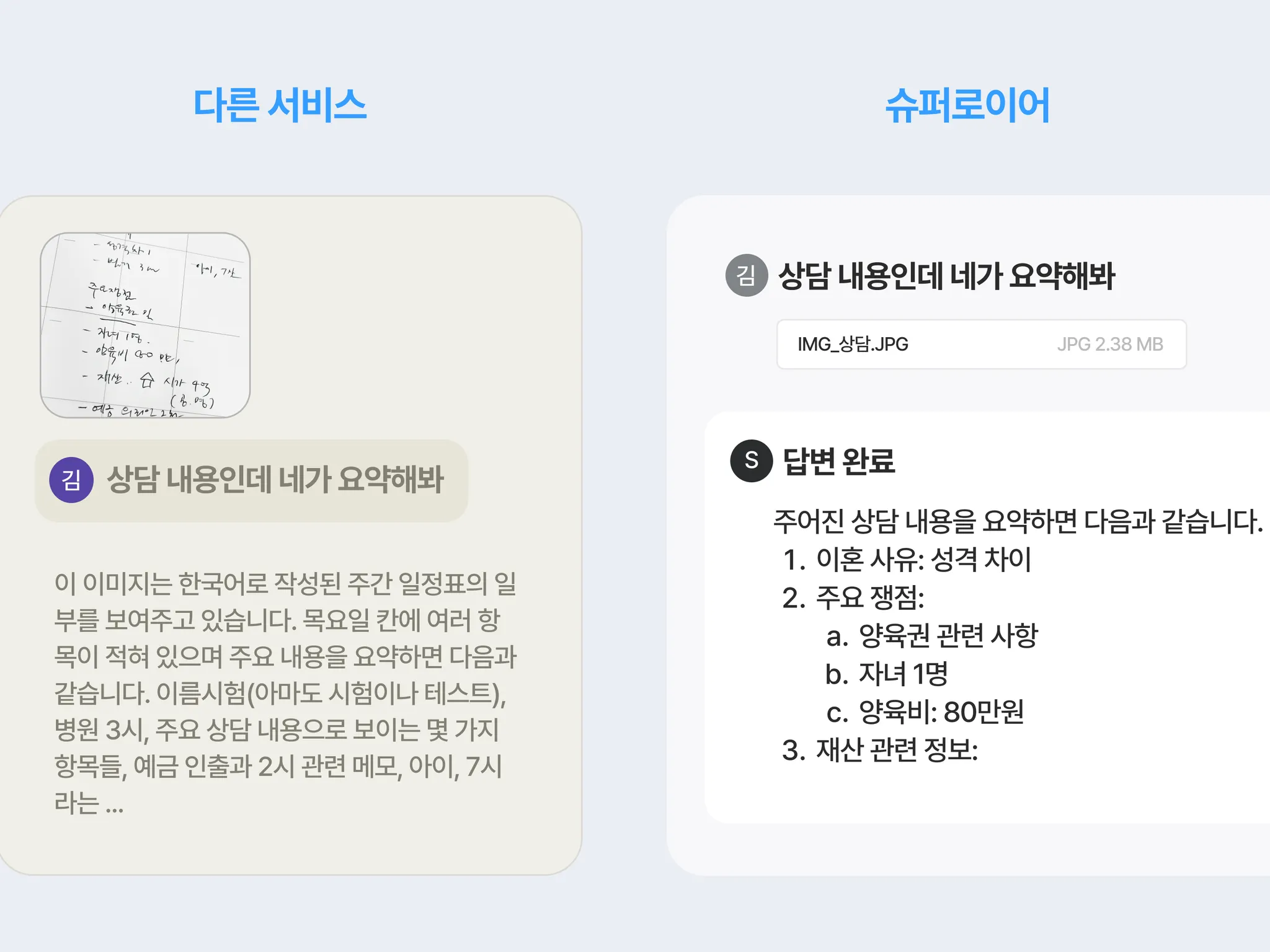 “PDF 안에 있는 내용을 텍스트 형태로 빠르게 읽고 싶을때 슈퍼로이어에게 파일을 첨부하고 이를 텍스트로 뽑아달라는 요청을 하고 있어요. 변호사마다 업무 처리 방법이 다를텐데, 저는 무조건 제가 읽어야하는 스타일이라 이런 식으로 슈퍼로이어의 도움을 받고 있습니다.”