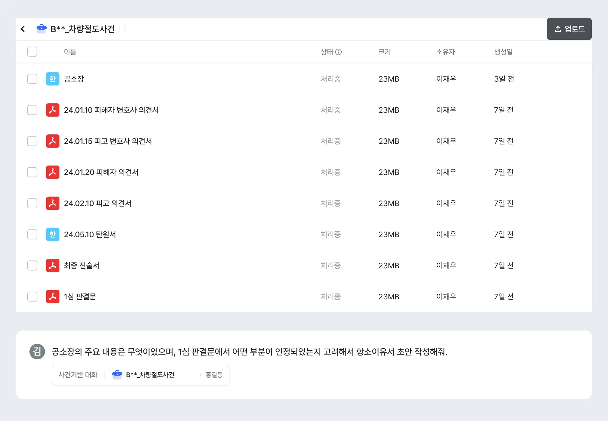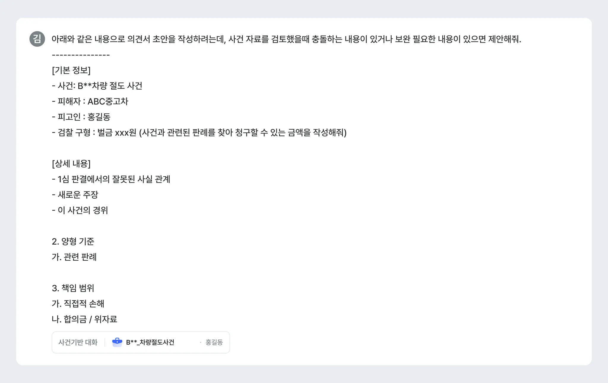 “1심 판결이 나왔거나, 참고할 자료가 많은 경우 그 자료에 대한 서면 초안 작성 (항소이유서 등)을 요청하면 업무 효율이 크게 상승합니다.”