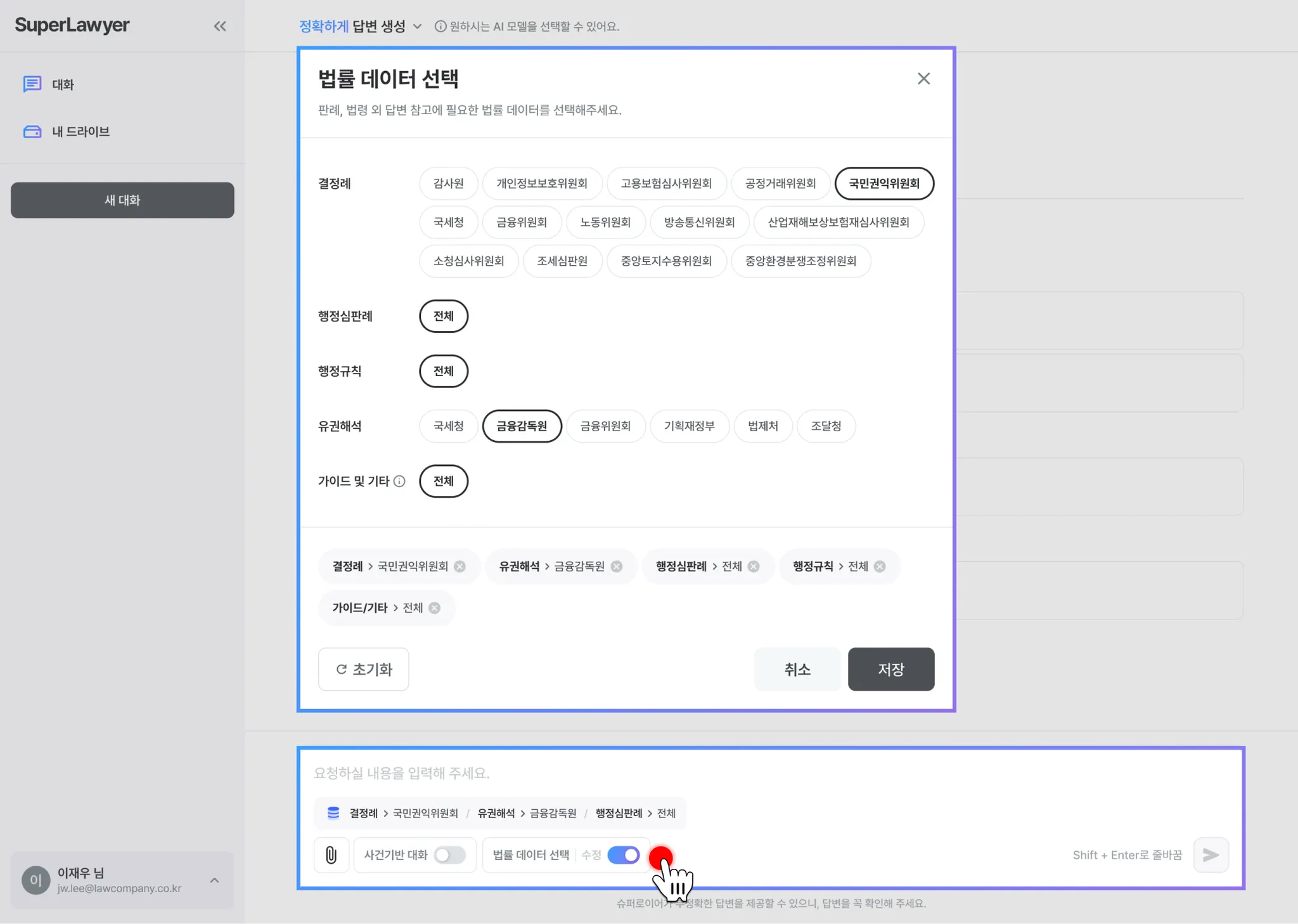 선례가 없는 사건을 진행 중이거나, 관련 법령이 명확하지 않으신 경우 또는 판례와 법령 외 다른 법률 데이터 검토가 필요한 경우 슈퍼로이어 법률 데이터 선택 기능을 활용해 결정례, 행정규칙, 유권해석 등의 법률 데이터를 한 번에 검색할 수 있어요.