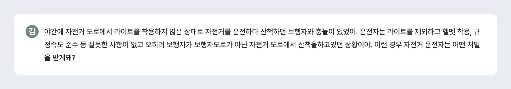 기존 판례 검색 서비스를 활용했다면‘자전거’, ‘라이트’, ‘보행자 충돌’ 등 사건과 관련된 키워드로 검색해 판례 전문을 검토해야했다면 슈퍼로이어를 활용할 경우 상황 설명과 함께 원하는 정보를 요청하면 정확한 답변을 빠르게 제공합니다.