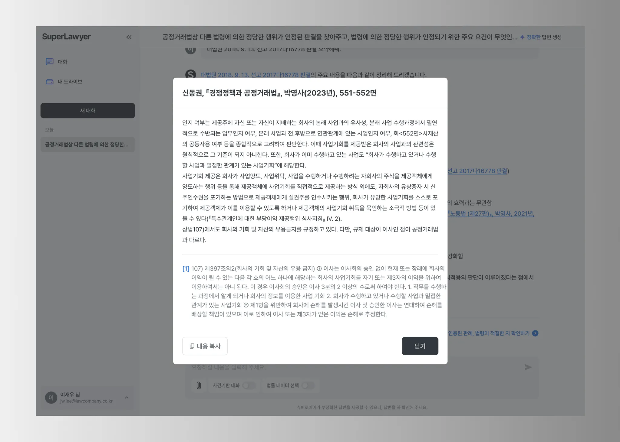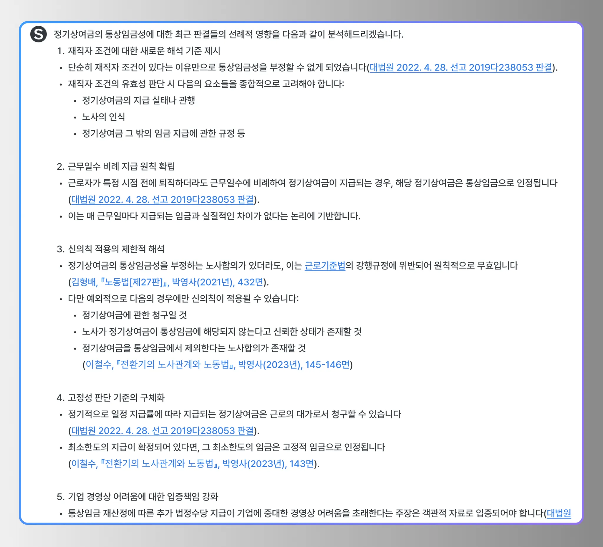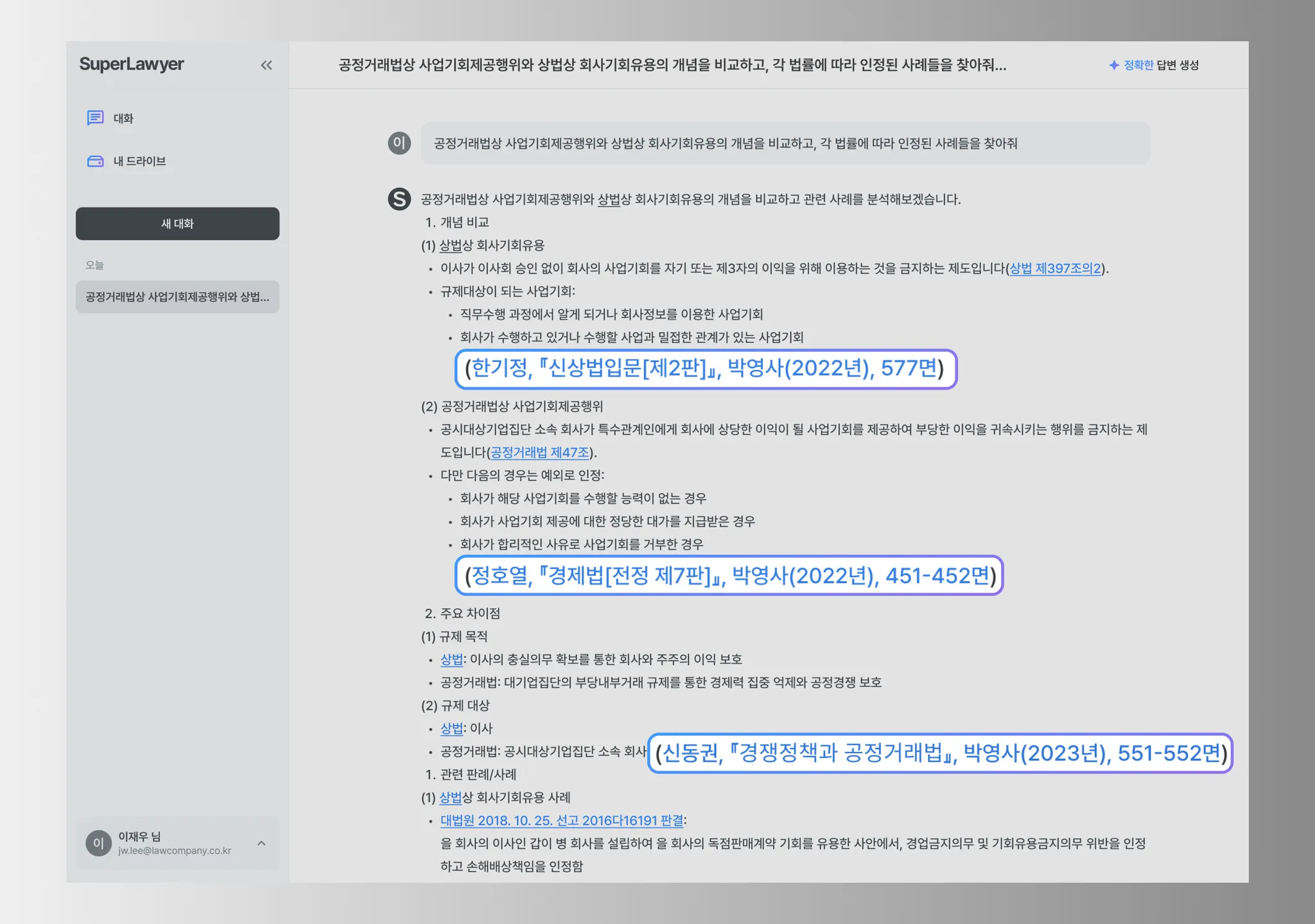 모든 답변에 (문서, 사건 기반 대화 포함) 판례, 볍령과 함께 박영사 서적 데이터가 인용되어 폭넓은 법률 검토와 실제 사례 확인은 물론, 복잡한 법률 주제나 개념을 해석하는데 도움을 줍니다.