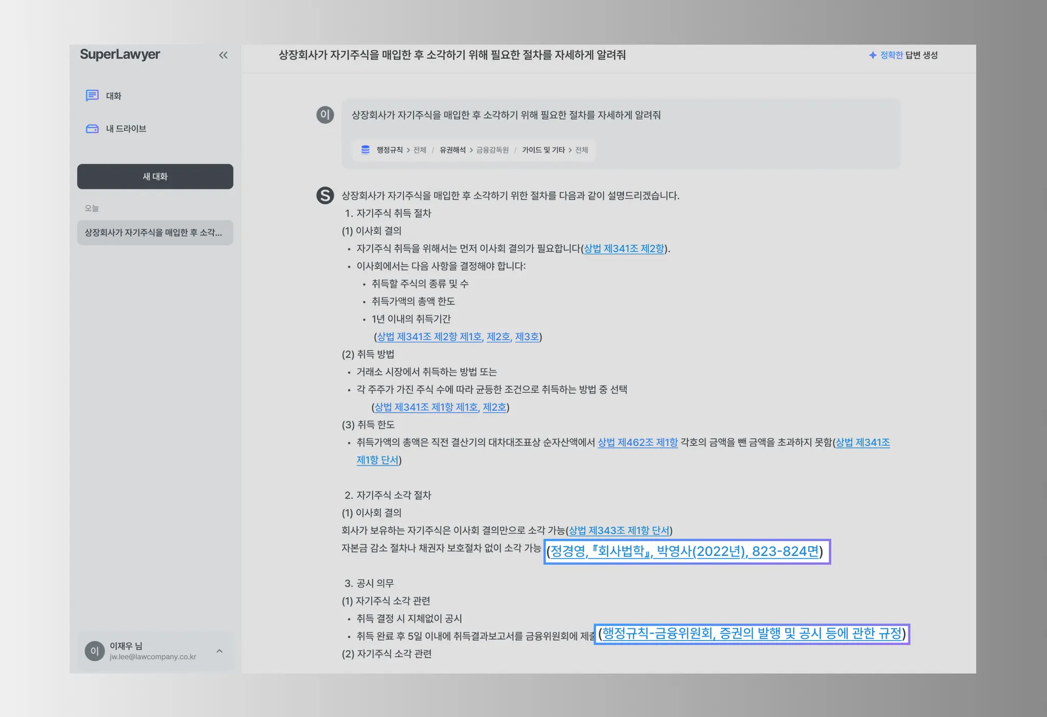 법률분야 1위 출판사인 박영사와 독점적 콘텐츠 공급계약을 체결하여 박영사의 권위있는 법학 교과서와 실무서들을 참조하여 이를 바탕으로 질의나 요청과 관련된 법해석 또는 해설을 인용하여 답변에 포함함으로써 보다 풍부하고, 근거있는 답변을 제공해드릴 수 있게 되었습니다.