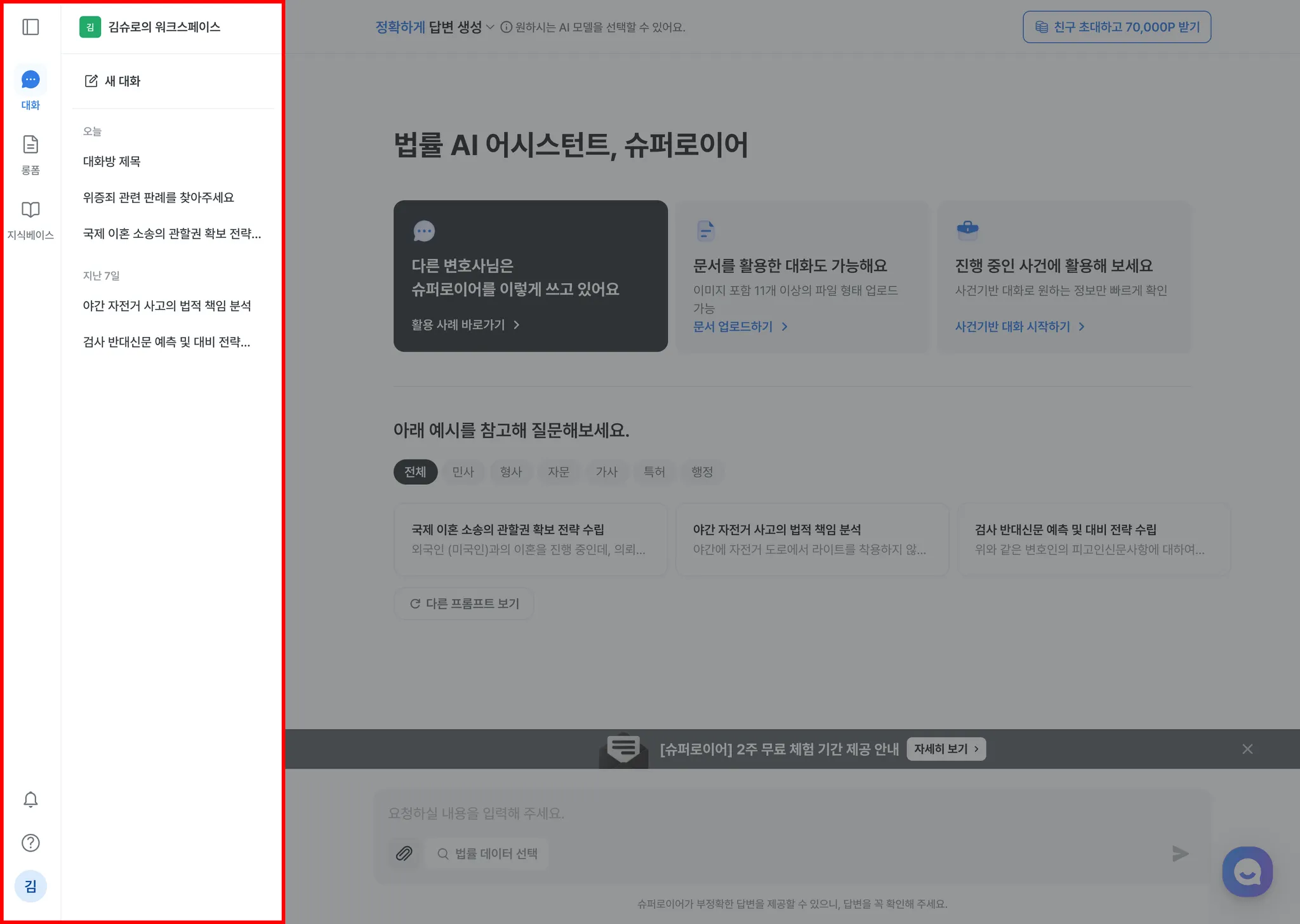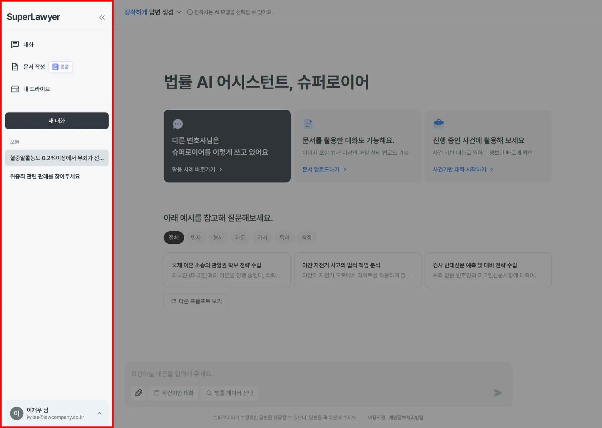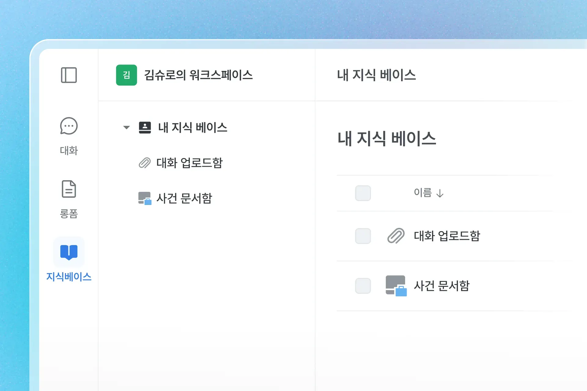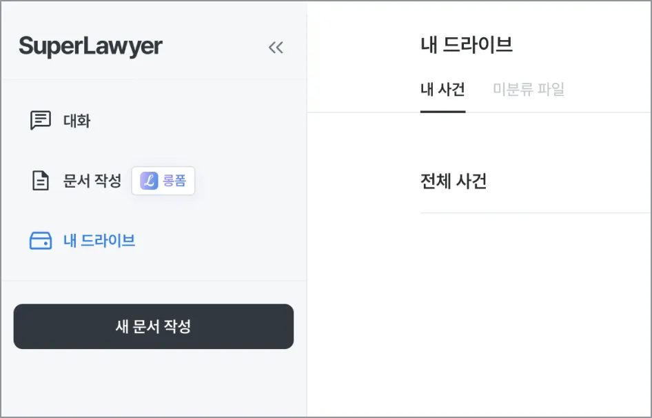 단순히 사건 관련 문서와 파일을 보관하던 ‘내 드라이브’와 달리, 슈퍼로이어는 이 자료들을 활용해 사용자의 요구를 해결하는 역할까지 수행합니다. 이러한 기능을 더 정확하게 표현하기 위해 ‘내 드라이브’의 이름을 지식베이스로 변경했습니다.