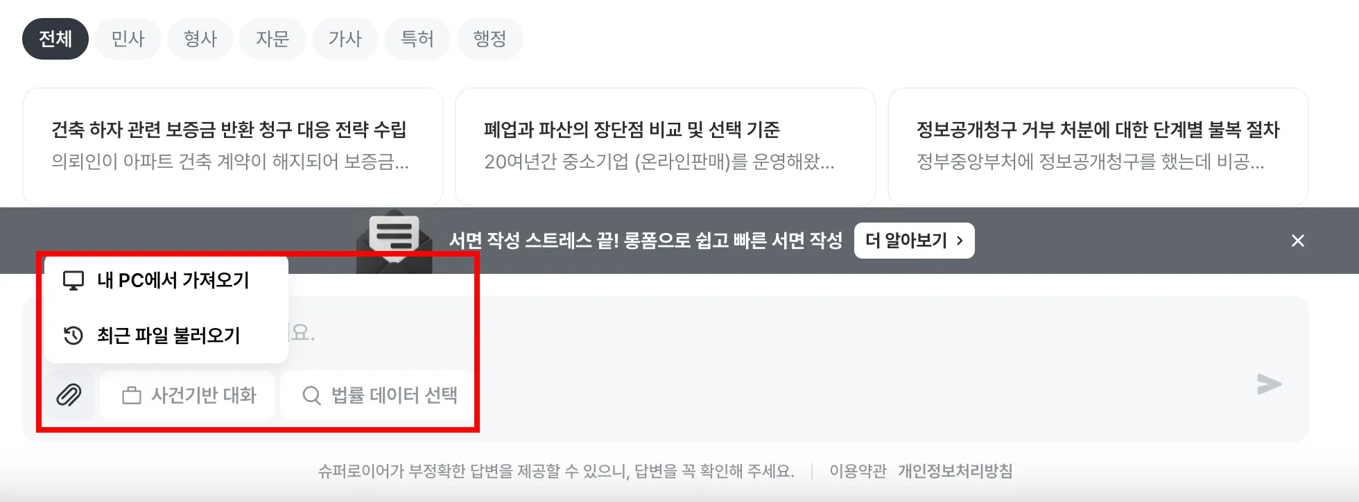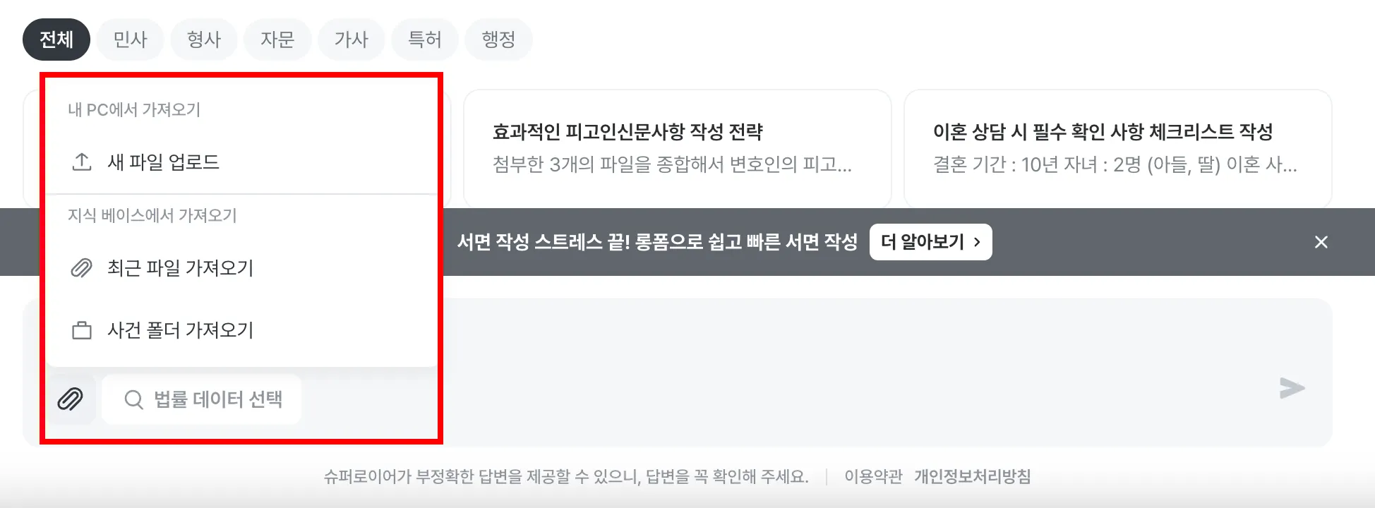 기존과 달리, 로컬 파일 업로드와 지식 베이스에 저장된 사건 폴더 및 파일 불러오기가 명확하게 구분되었습니다. 통합된 대화 메뉴에서 필요한 자료를 손쉽게 선택할 수 있습니다.