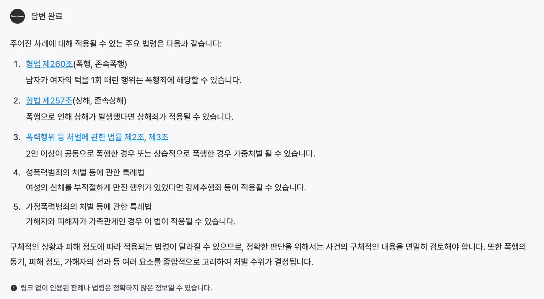 슈퍼로이어가 생성한 답변 중 법률 정보를 인용했으나 링크가 없는 경우 정확하지 않은 정보임을 회원이 인지할 수 있도록 안내 문구를 제공합니다.
