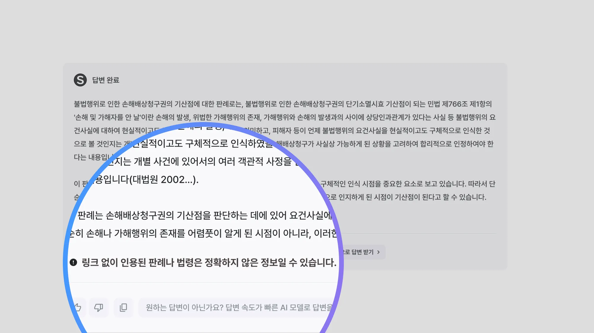 답변에 법률 정보를 인용했으나, 연결 링크가 걸려있지 않은 법률 정보가 있는 경우 경고 문구가 제공됩니다.