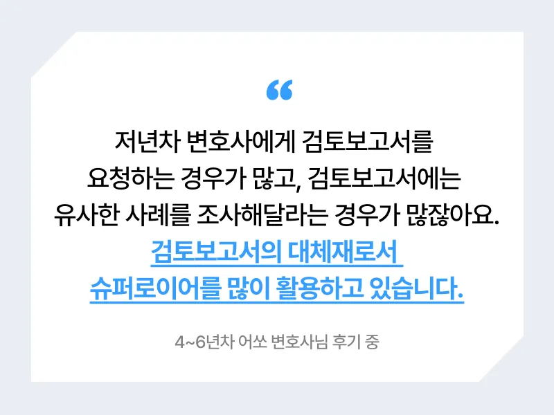 저년차 변호사에게 통상적으로 요구되는 판례 리서치, 리서치에 있어 힘을 덜어줄 수 있어 유용했다는 의견도 남겨주셨어요.