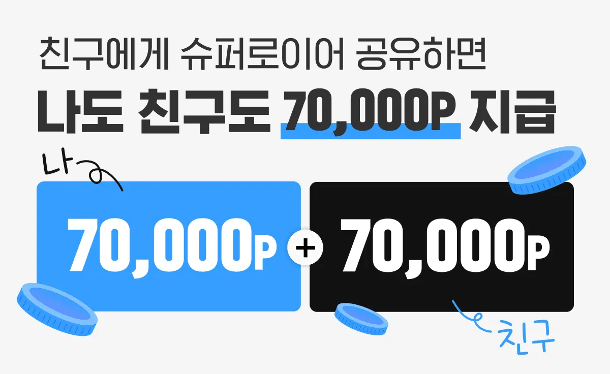 슈퍼로이어 꿀팁 2. 친구 초대하면 나도 친구도 70,000P
